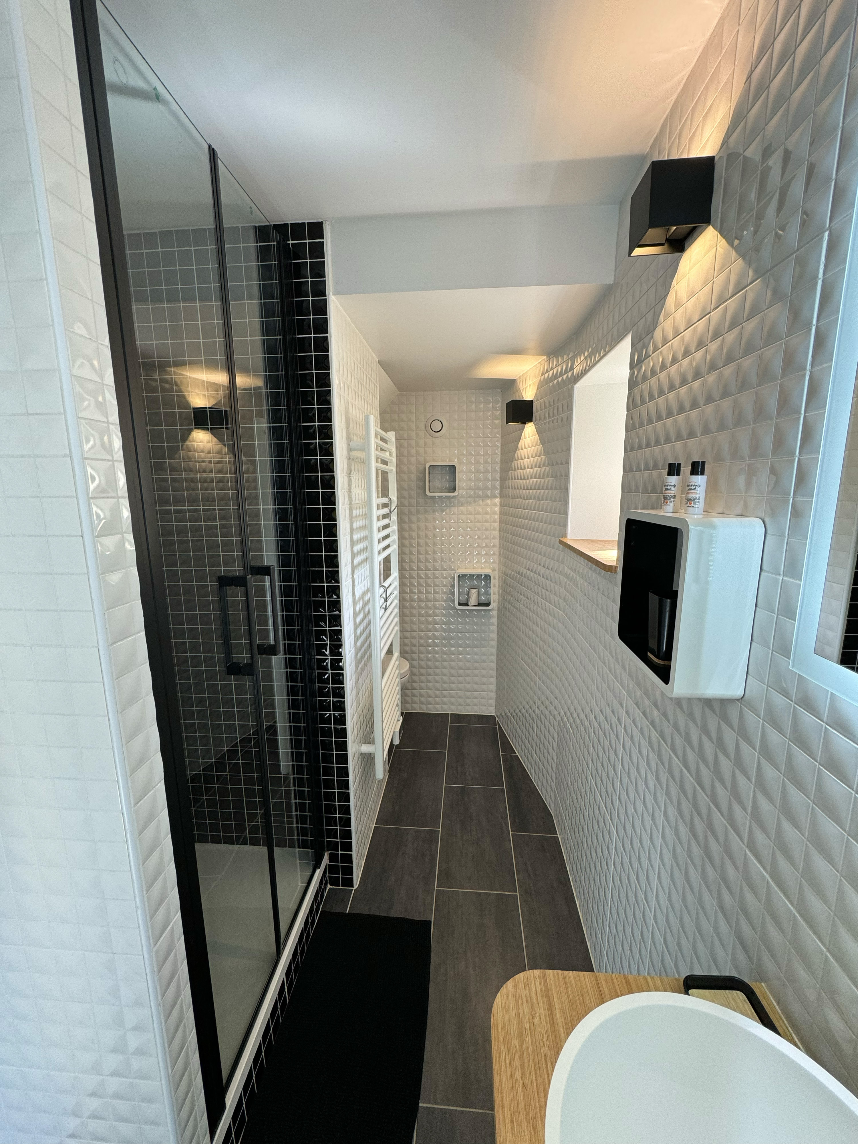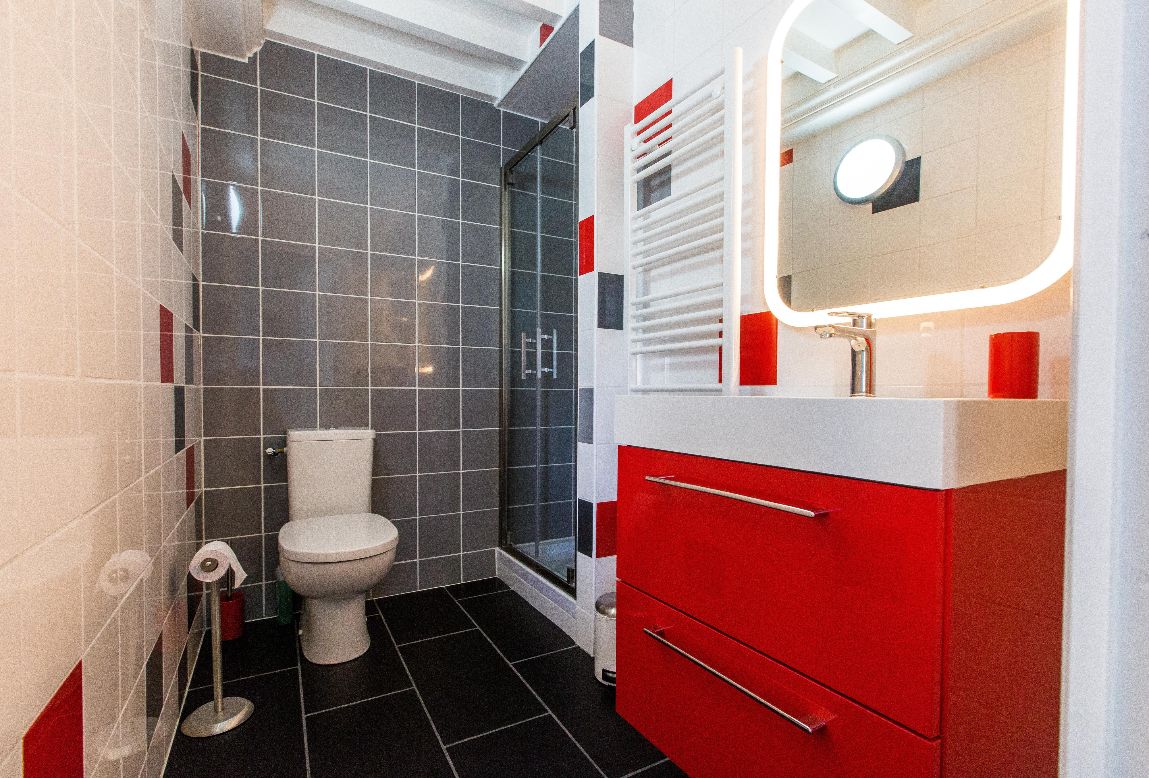 Douche, WC, sèche-serviettes, meuble-vasque, étagère, patères, sèche-cheveux, serviettes de toilette.