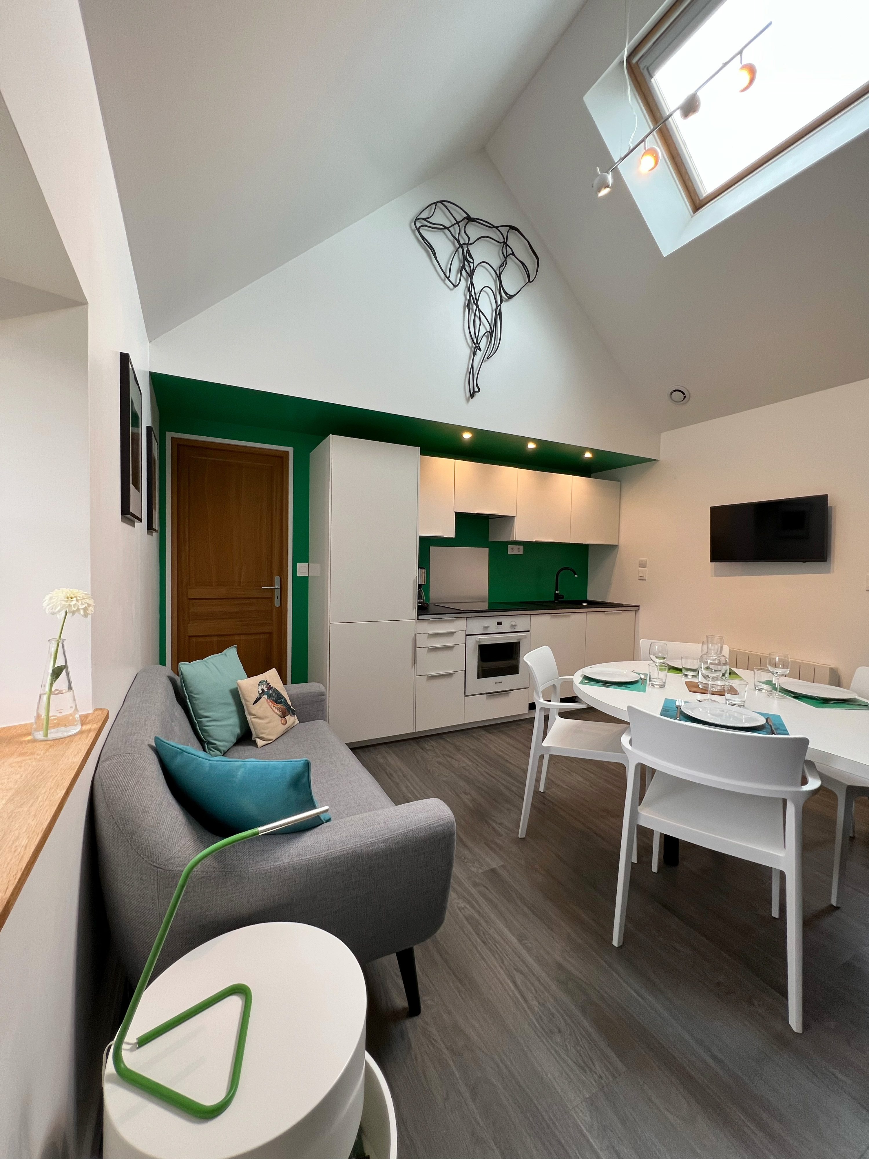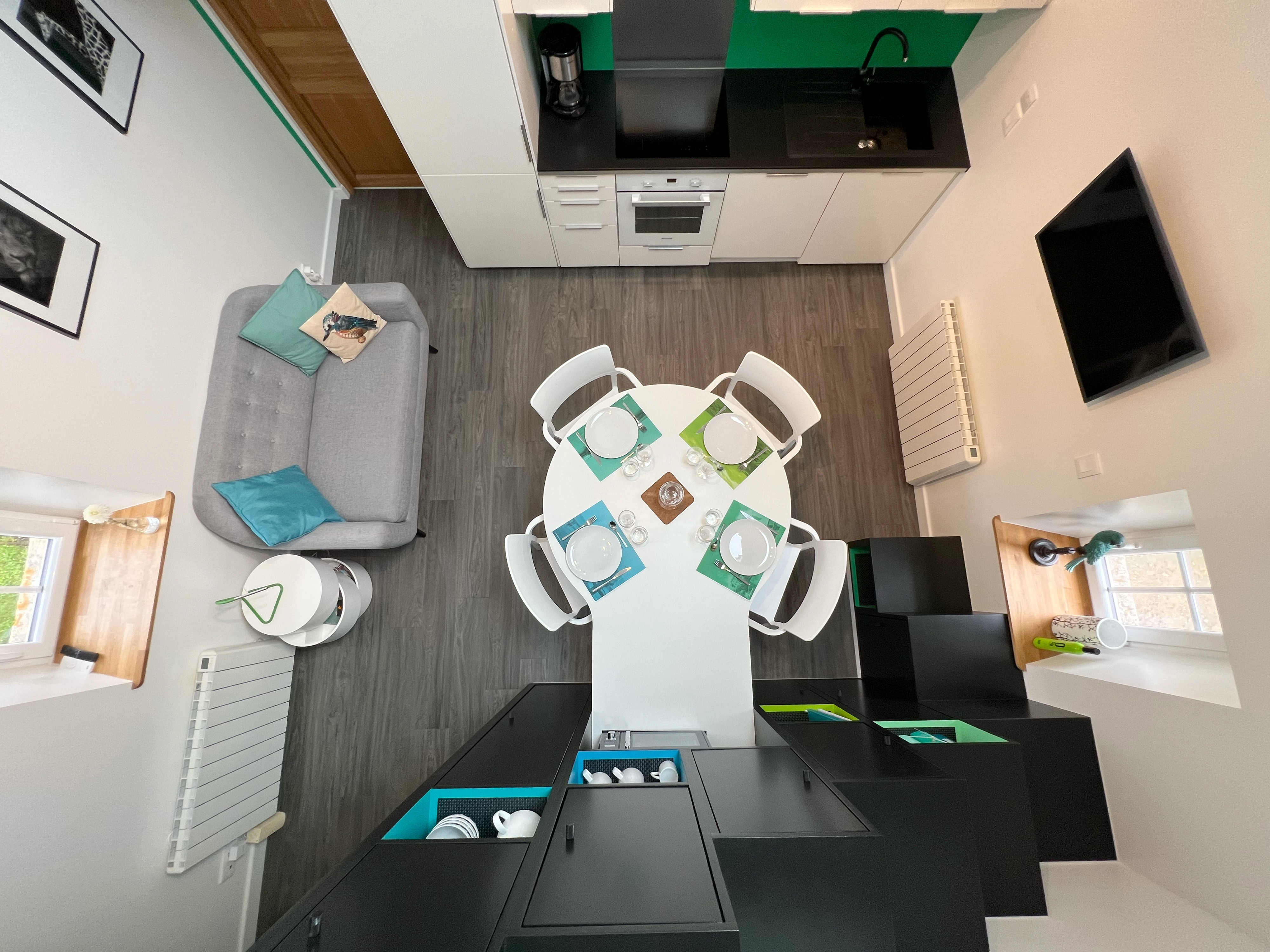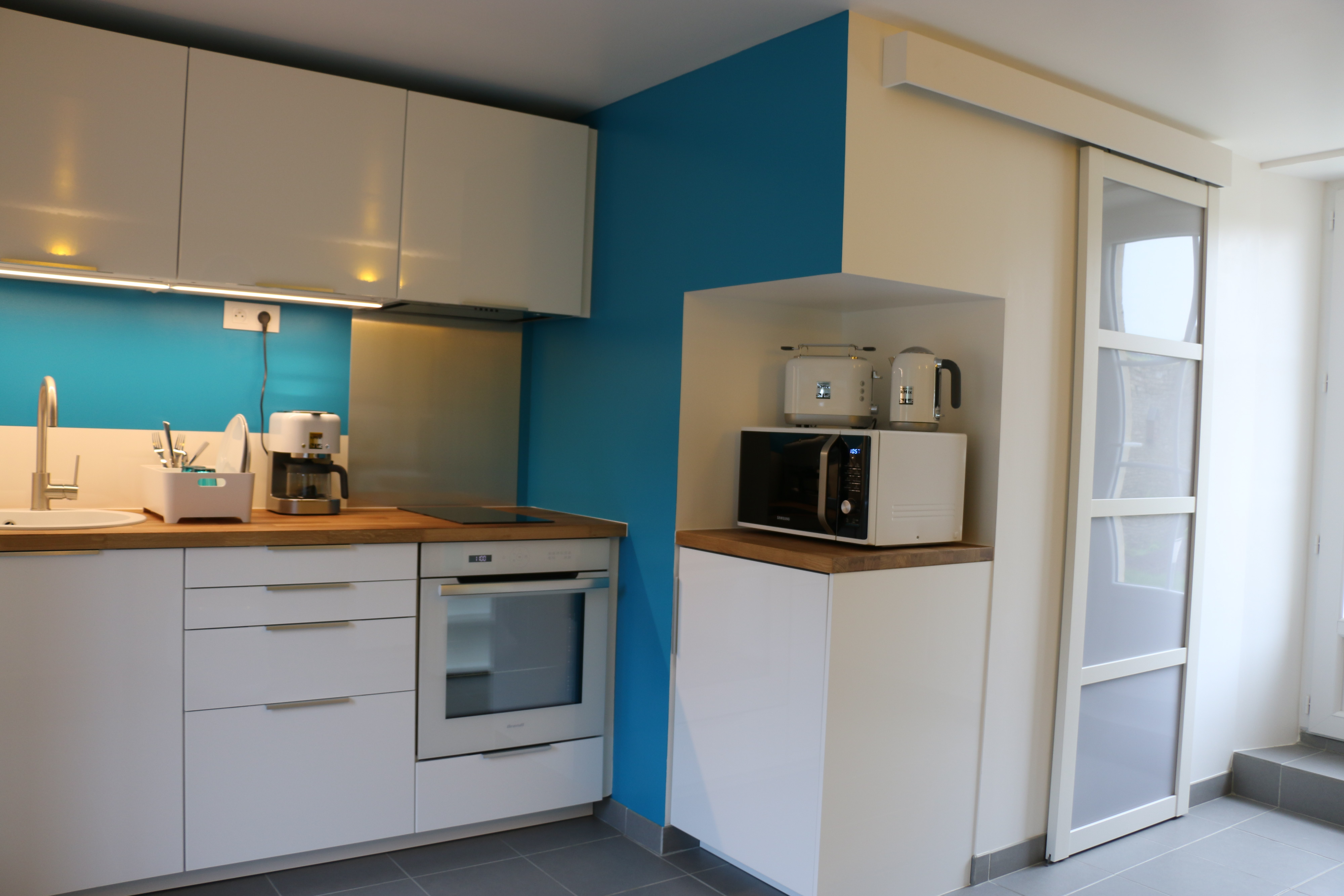Cuisine équipée : Placards, réfrigérateur, congélateur, four, plaques induction, hotte, lave-vaisselle, évier, micro-ondes, cafetières à filtre et Nespresso, grille-pain, bouilloire, ustensiles de cuisine, vaisselle, etc.