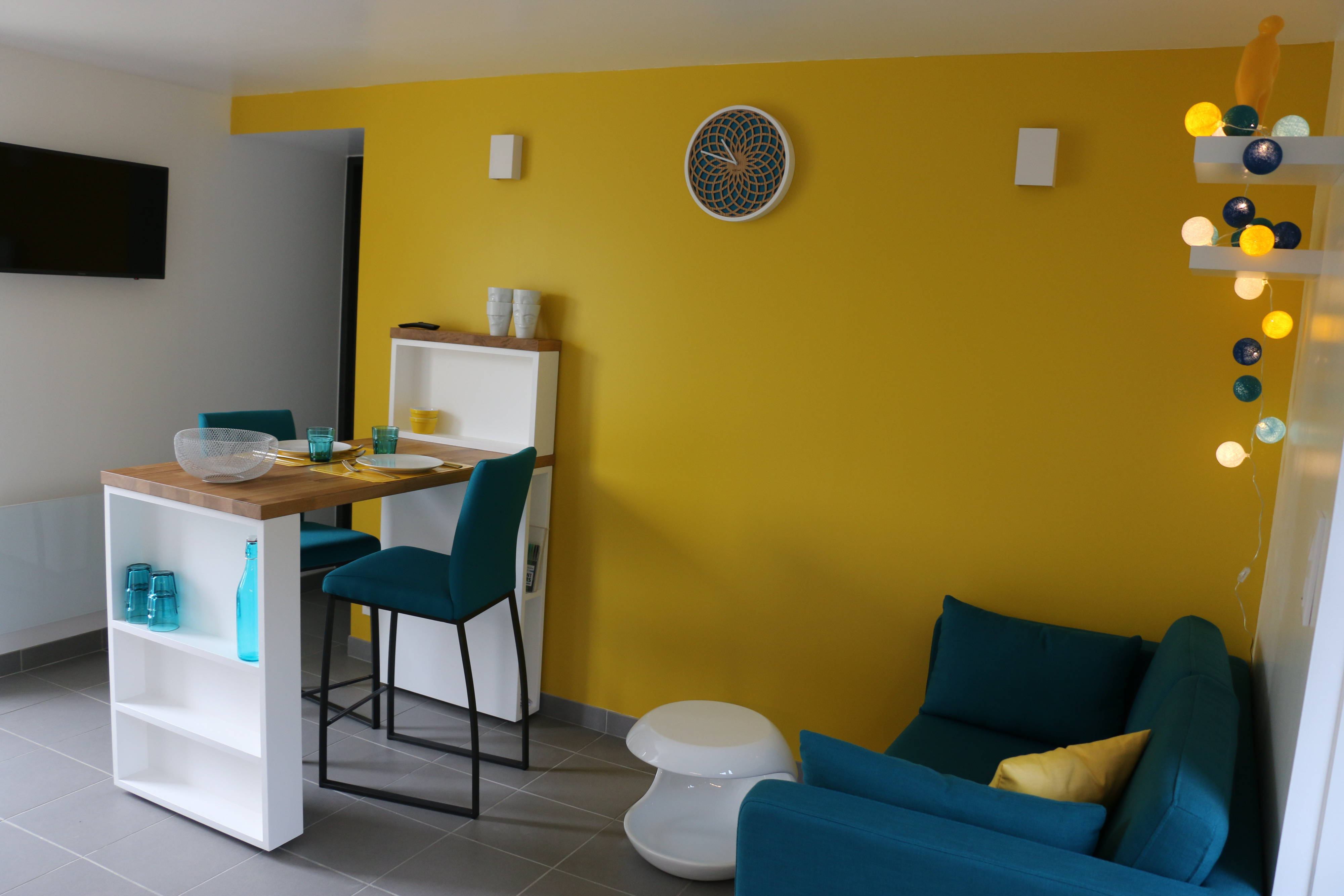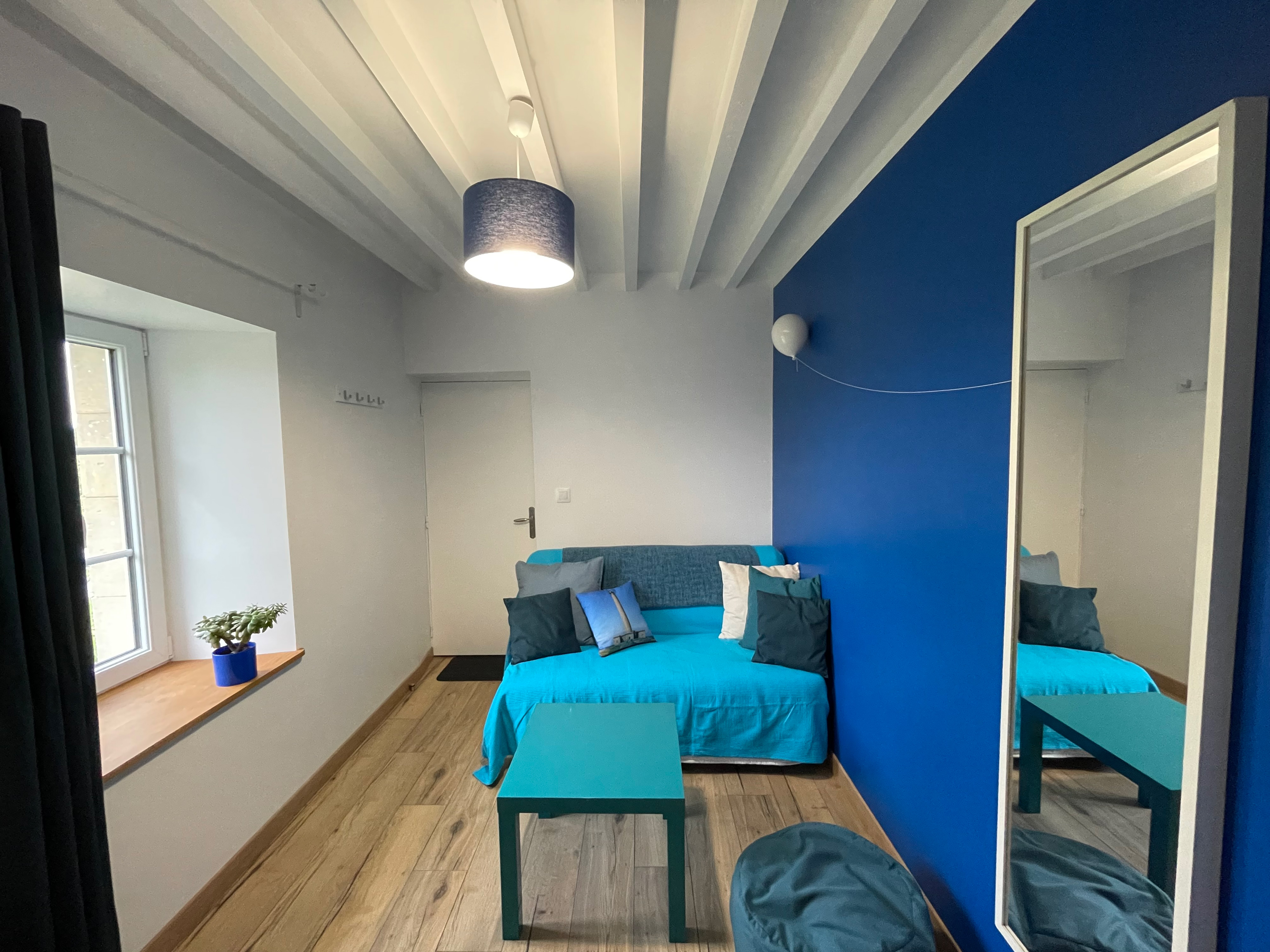 Canapé 2 places convertible, table basse, étagères et petit réfrigérateur (très silencieux), moustiquaire.