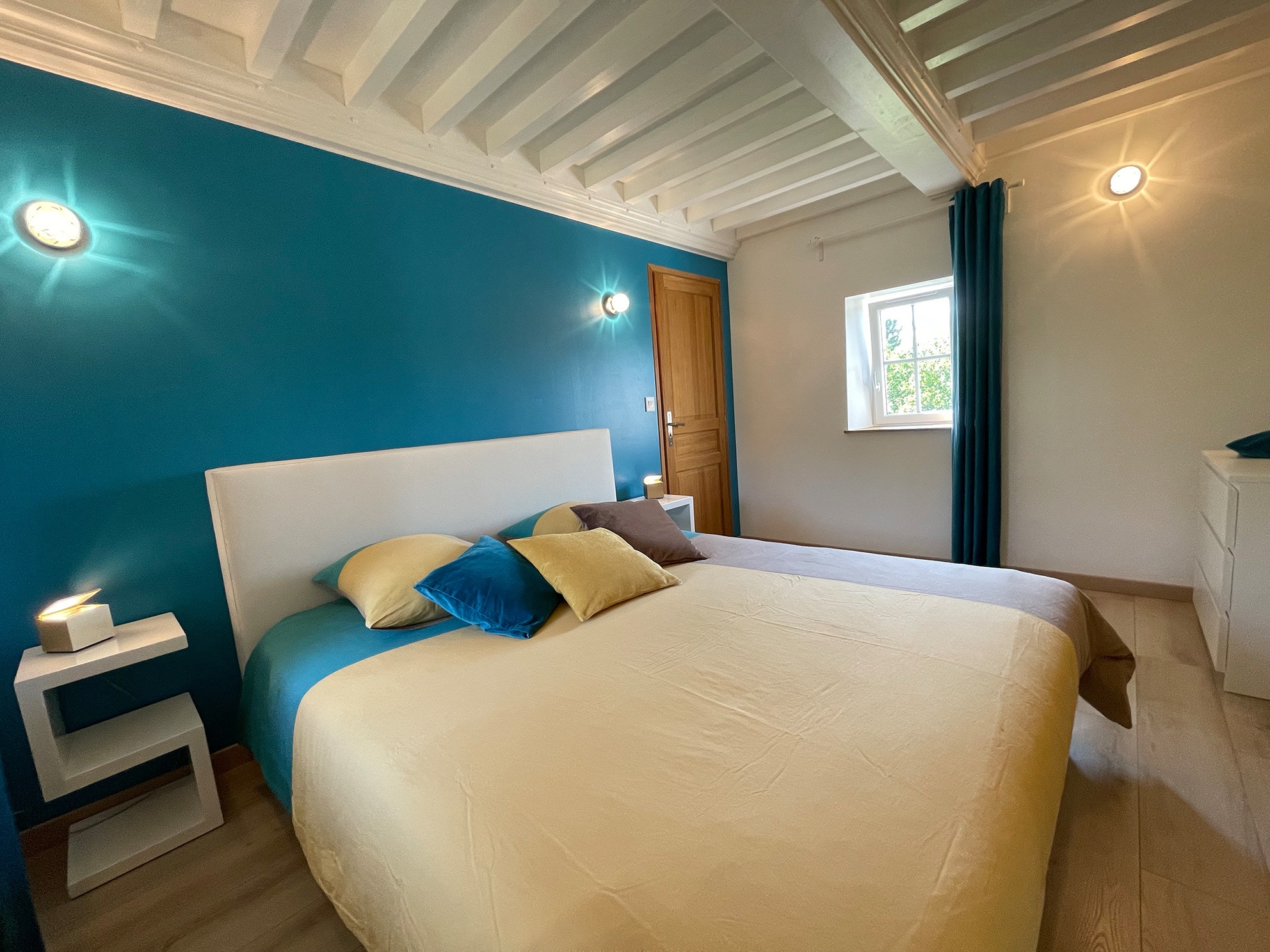 Lit 180 x 200 cm, armoire avec côté penderie et côté étagères, tables et lampes de chevets, fauteuil et table basse, moustiquaire.