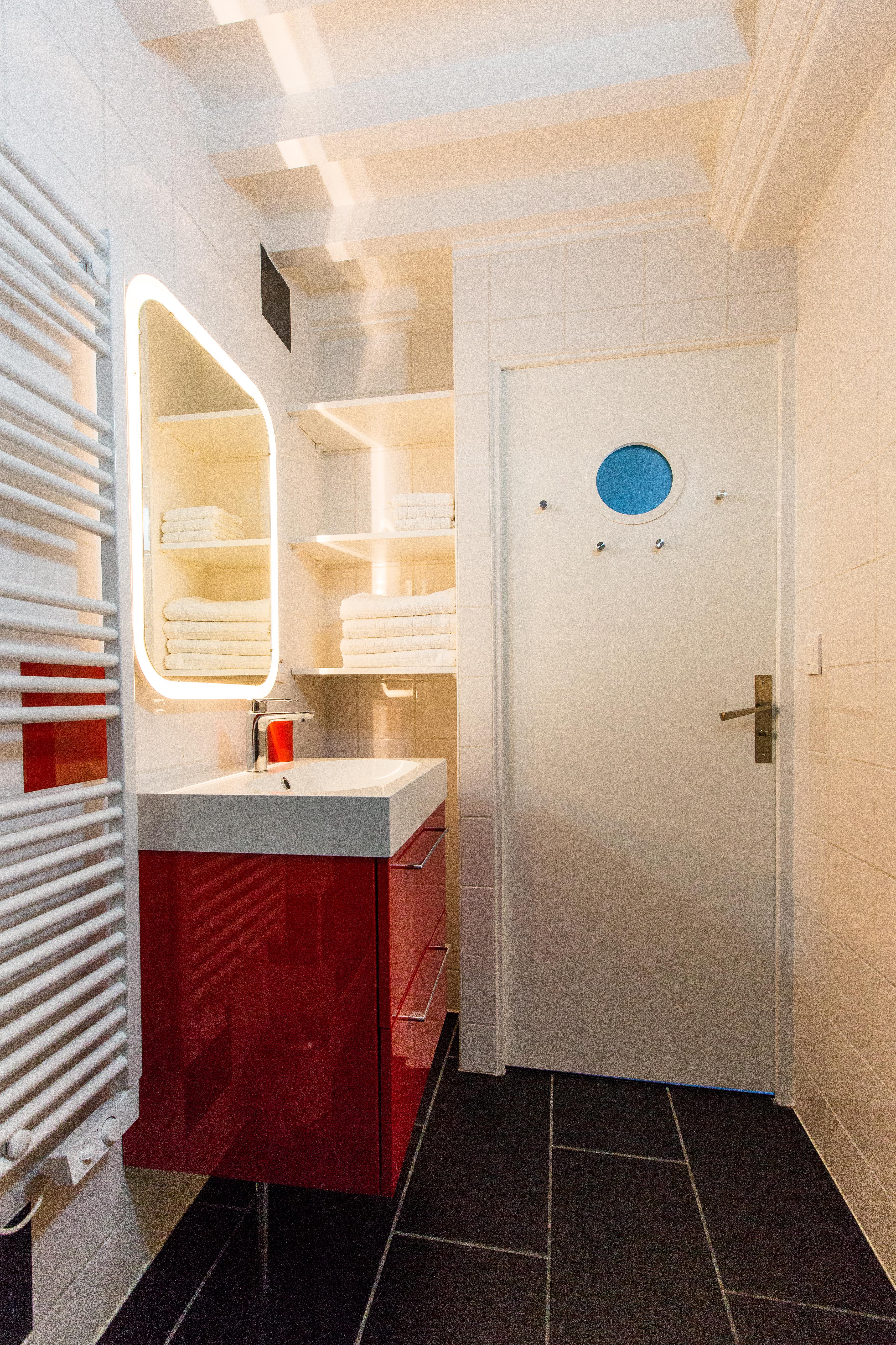 Douche, WC, sèche-serviettes, meuble-vasque, étagère, patères, sèche-cheveux, serviettes de toilette.