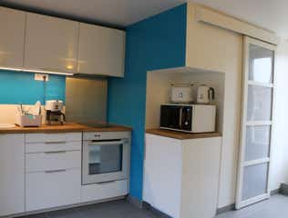 Cuisine équipée : Placards, réfrigérateur, congélateur, four, plaques induction, hotte, lave-vaisselle, évier, micro-ondes, cafetières à filtre et Nespresso, grille-pain, bouilloire, ustensiles de cuisine, vaisselle, etc.