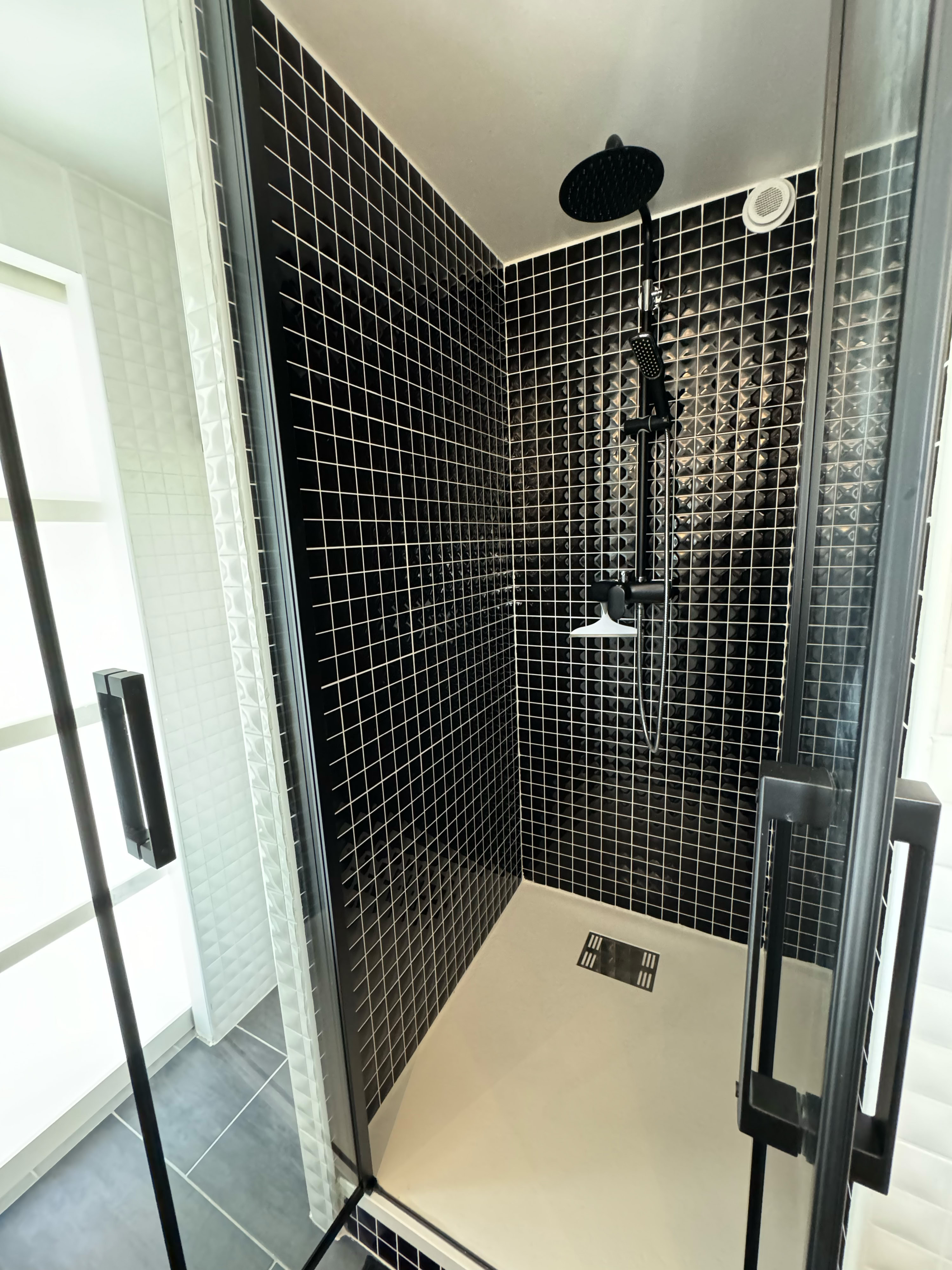 Shower, toilet, heated towel rail, vanity unit, shelf, hooks, hairdryer, bath towels.